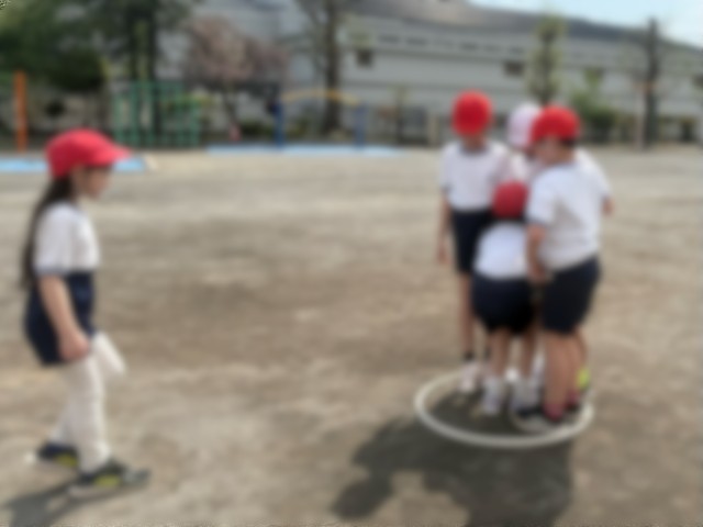 順番でフラフープの中に入っていきます。チームで順番を考えたり、バランスを崩さないように慎重に入ったり、色々な工夫が見られました。