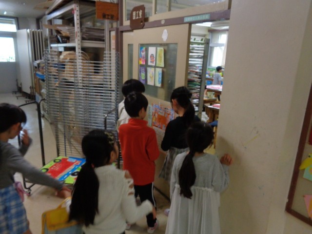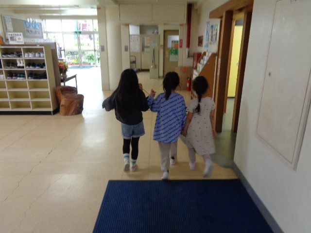 2年生と1年生が一緒に学校探検をしました。