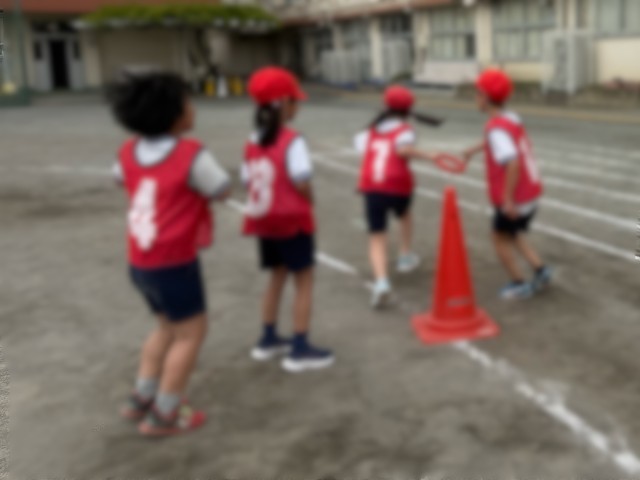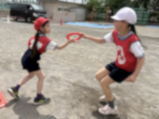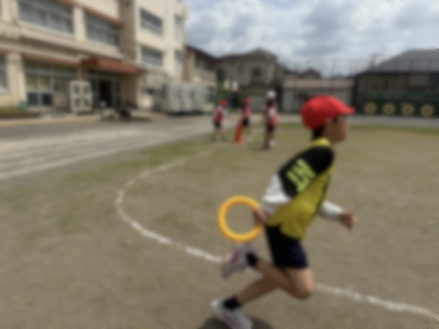 体育ではチームに分かれてリレーを行いました。それぞれのチーム、応援の声が響き渡っていました。