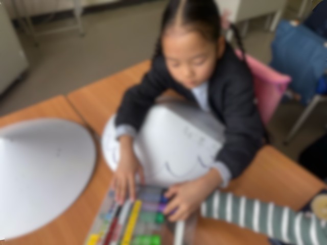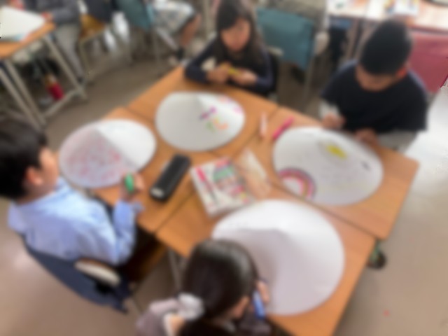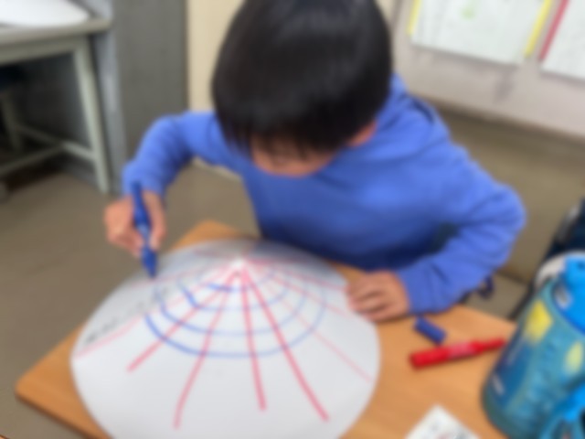 練習用の花笠に色をつけたり、模様をつけたり、自分だけの花笠をつくりました。