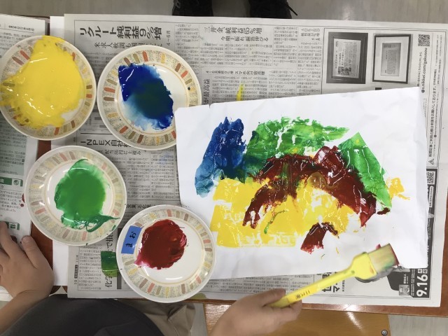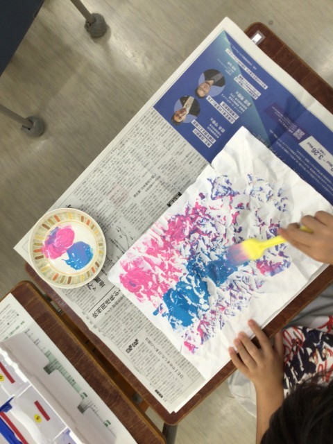 画用紙を大胆に丸め、好きな色をハケで塗り広げていきました。子どもたちは、とても楽しそうに取り組んでいました。