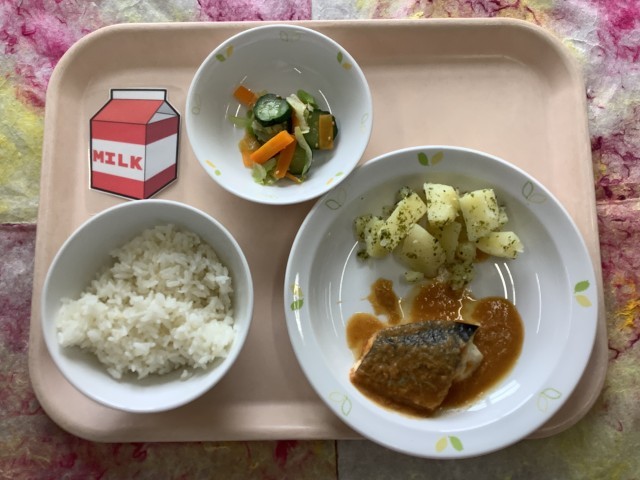 今日はお魚の和食献立です。ほんの少しだけ辛いけれど、ピリ辛ソースはお魚によく合います。お家で作ってみたいとレシピをもらいにくる子もいます。お魚を食べる機会が減ってきていますが、給食でお魚が出る日は残さず食べてくれたら嬉しいです。