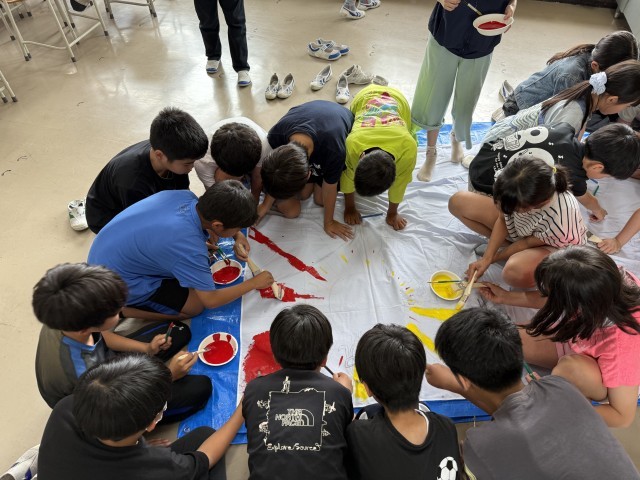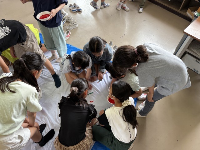 大漁旗をクラスで制作中!下書きが終え、ようやくみんなで色付け開始です。どんな旗になるのか今から楽しみです。