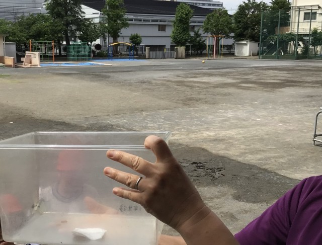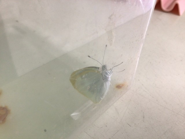 今日の朝、虫籠の中にはモンシロチョウがいて、子ども達は大喜び。みんなで校庭に蝶を放してあげることにしました。