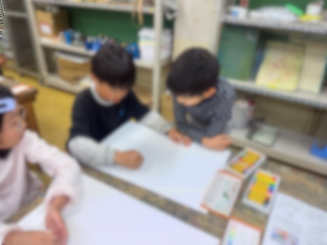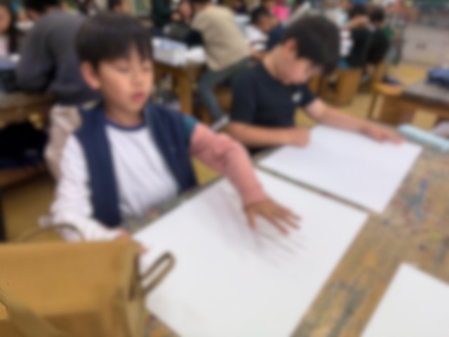 図工の時間では白色のクレパスでお城の枠組みを書き、その中に絵の具で色を塗ると、素敵な絵が完成します。個性あふれるお城が完成していました。