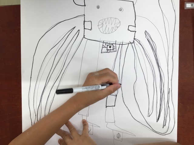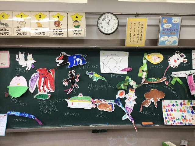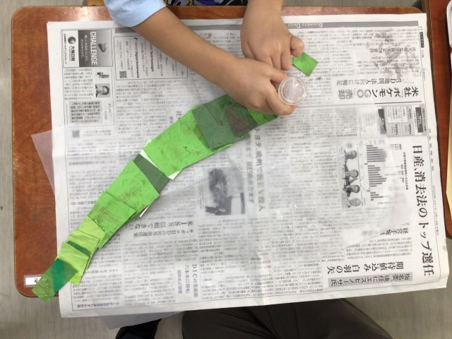 今日の図工は、子どもたちがオリジナルの生き物などを描き、以前絵の具で色を塗った画用紙を切って、繋げてしっぽをつけました。