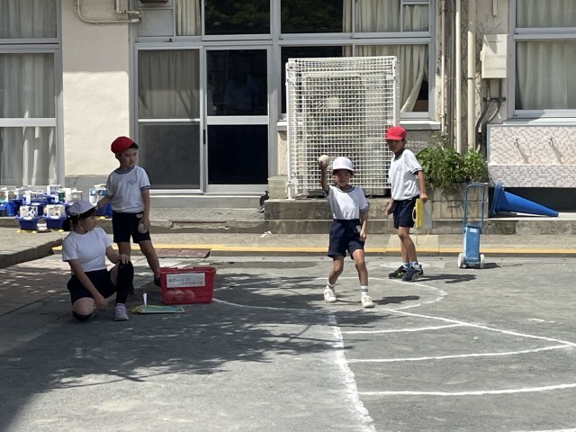 スポーツテスト当日、雨で延期になったソフトボール投げ、金曜日に実施しました。