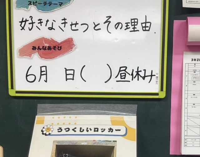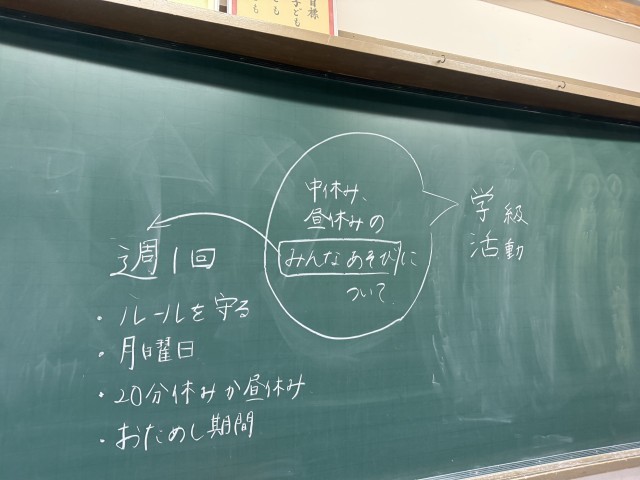 学級で話し合いをしました。今回は「休み時間について」です。学級全員であそぶ休み時間を「みんなあそび」と名づけ、お試し期間で1学期行うことになりました。週1回、決まった曜日に行うということや「全員がルールを守らなければ楽しくない」という話しからお試し期間を終えた2学期からは遊びの内容やルールまで子どもたちで決められるようにしていこうという話し合いになりました。クラスのことを考えられていた子どもも多く、成長を感じました。