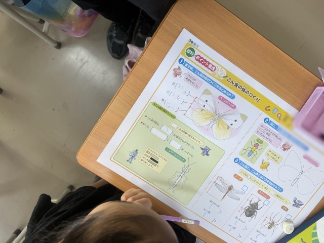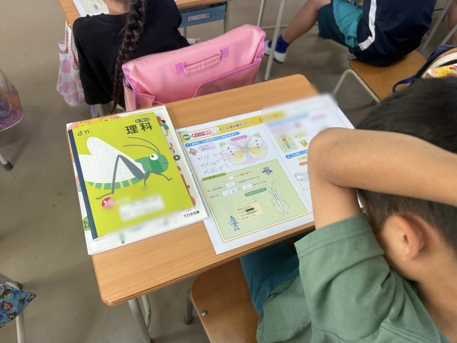 理科では、昆虫の頭・胸、腹がどこなのかを考えました。昆虫は必ず胸に足が6本という発見もありました。それ以外は昆虫と呼ばないことも学べました。