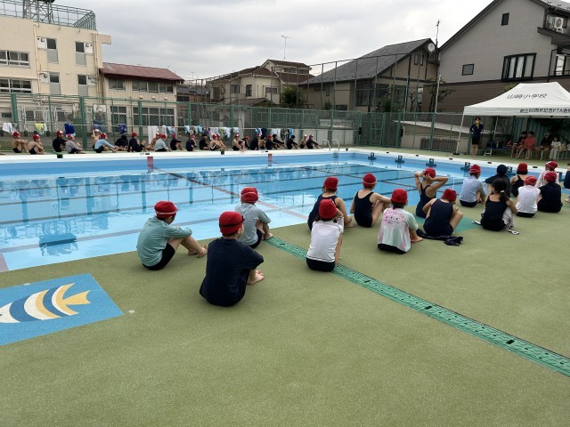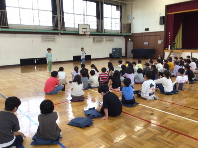 いよいよ水泳指導が始まりました!初回は,天気に恵まれず…体育館で学年のプール開きを行いました。各クラスの代表2人が、自分のめあてをしっかりとみんなの前で話してくれました。みんなも自分のめあてを立てました。