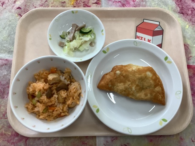 今日の「パリッとカレー揚げ」は見た目がジャンボぎょうざですが具材が違います。中にはカレー味のじゃがいも、たまねぎ、にんじんなどが入っています。チキンライスやイタリアンサラダも「美味しくなあれ」と一生懸命作ったので残さず食べてくれたら嬉しいです。