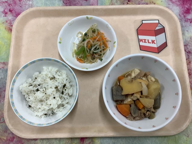今日は煮物が主菜の和食献立です。豚肉、ごぼう、にんじん、じゃがいも、こんにゃくや厚揚げなどの食材を給食室の大きな釜でグツグツ煮て作ります。いろいろな食材が入っているのでバランスよく食べて栄養を摂りましょう。