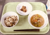 今日は、なめたけご飯、豆腐とお麩の煮物、根菜チップス、牛乳です。なめたけは、そう...