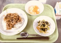 今日は、かき揚げ丼、大根ともやしのピリ辛和え、味噌けんちん汁、牛乳です。味噌けん...