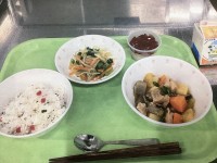 今日は、鯛めし、じゃこカツ、いもたき、果物(紅マドンナ)、牛乳です。高級料理の「...