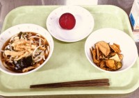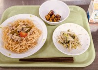 今日は、うま塩焼きそば、キャラメルポテト、ワンタンスープ、牛乳です。スープに入っ...