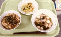 今日は、かて飯(混ぜご飯)、ゼリーフライ、かぶの味噌汁、果物(夢オレンジ)、牛乳...