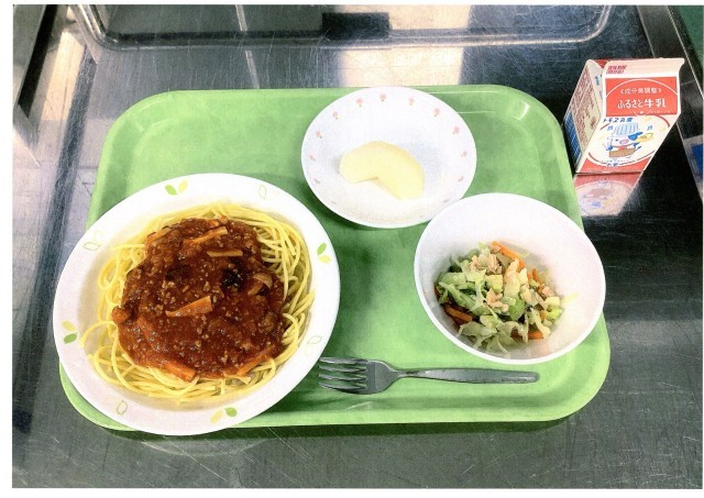 今日は、きのこのミートスパゲッティ、ツナサラダ、果物(梨)、牛乳です。