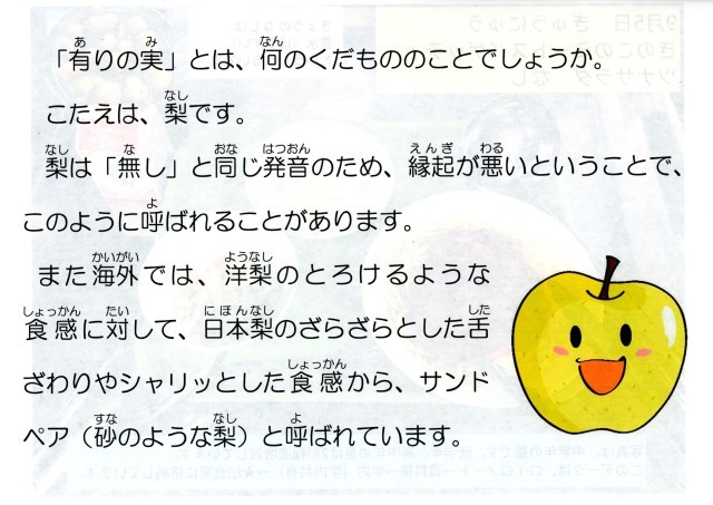 今日は、梨です。日本の梨には、赤梨、青梨があるそうです。