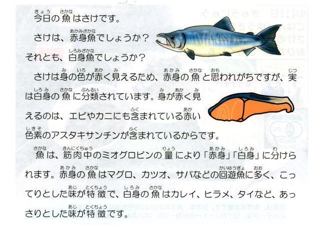 今日は、ご飯(有機米)、鮭の味噌マヨネーズ焼き、お浸し、五目汁、牛乳です。