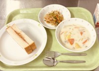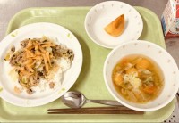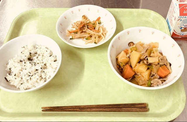 今日は、わかめごはん、五目肉じゃが、野菜のごま和え、牛乳です。