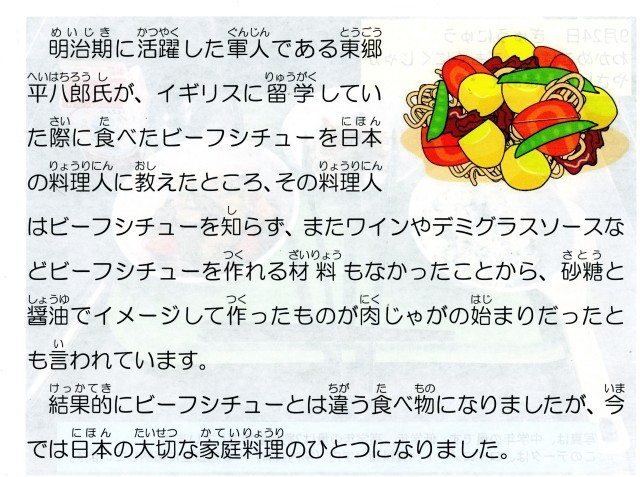 肉じゃがのルーツが東郷平八郎にあるという「東郷平八郎発祥説」は舞鶴市の「まいずる肉じゃがまつり実行委員会」町おこしのために創作した話のようですが、これに便乗して呉市が東郷平八郎は舞鶴より前に呉に赴任していたので肉じゃがの発祥は呉だと主張し、「くれ肉じゃがの会」が結成されて、発祥の地論争が起きているようですが、これにより「肉じゃがご当地」が注目をあびるようになり、舞鶴としては、「呉にもがんばってくれ」という気持ちなのではないかと思います。