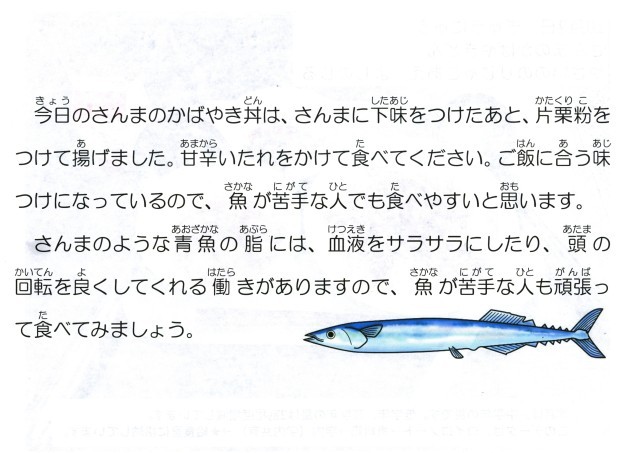 今日のさんまのかば焼き丼は、さんまの切り身を竜田揚げにしてご飯の上に乗せ、たれをかけてかば焼き風にしたもです。竜田揚げにたれをかける、たつた、これだけでかば焼き風になるのですね。たれがとても美味しいのですが、かけすぎて他の人の分が足れなくならないように気をつけましょう。