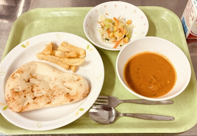今日は、ナン、バターチキンカレー、スパイシーポテト、コーンサラダ、牛乳です。