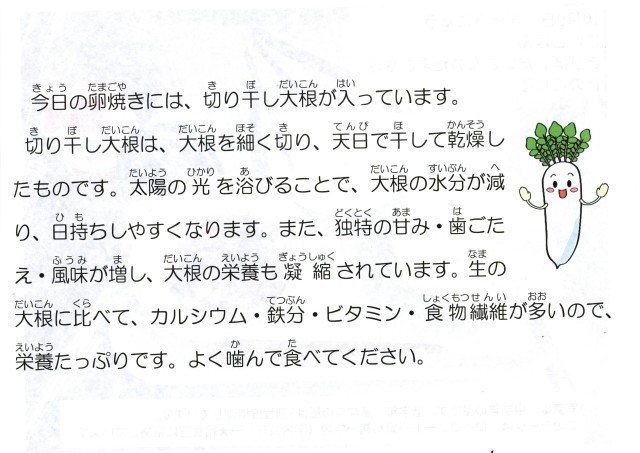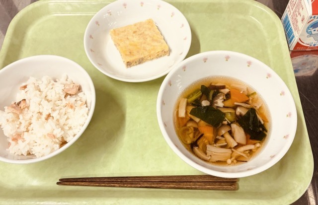 今日は、鮭ご飯、切干大根の卵焼き、きのこ汁、牛乳です。