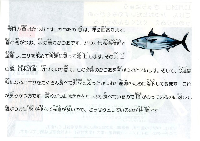 今日は、かつおと大豆のみそがらめ、梅のり和え、具だくさん味噌汁、ご飯、牛乳です。