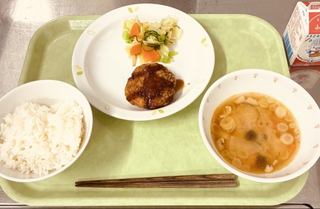 今日は、ご飯、メンチカツ、キャベツと昆布の浅漬け、さつま汁、牛乳です。
