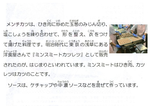 コロッケとメンチカツ、よく似た料理ですが、コロッケがフランス料理のクロケットが基になったのに対し、メンチカツは日本の洋食屋さんが考案したのですね。洋食屋の店主が外国人の客に「ひき肉は英語で何というのか」と尋ねたところ、「Mince meat(ミンスミート)」と答えたのを「メンチミート」と聞きこえたそうです。英語の発音ですから、どちらが正しいとは言えないですけど、「ミンスミート」と聞き取っていれば、「メンチカツ」ではなく「ミンスカツ」になっていたかもしれません。「ミンスカツ食べてみんすか?」なんて言ってみたかった気がします。