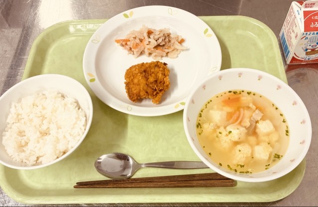 今日は、ご飯、クリスピーチキン、ツナと大根のサラダ、チーズと卵のふわふわスープ、牛乳です。