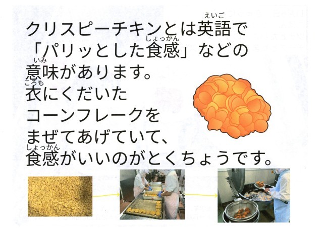 給食でクリスピーチキンとは、ビックリスピーです。衣がサックサクです。これは衣にくだいたコーンフレークをまぜているからなのですね。