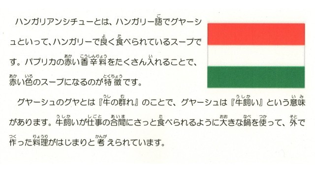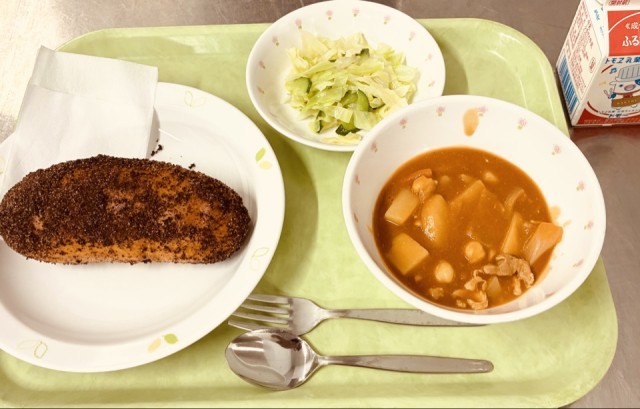 今日は、ココアあげパン、ハンガリアンシチュー、グリーンサラダ、牛乳です。