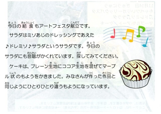 今日は、キャベツ入りガーリックパスタ、♪ドレミソ♪サラダ、マーブルアートケーキ、牛乳です。
