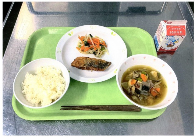 今日は、さわらの竜田揚げ、お浸し、田舎汁、牛乳です。