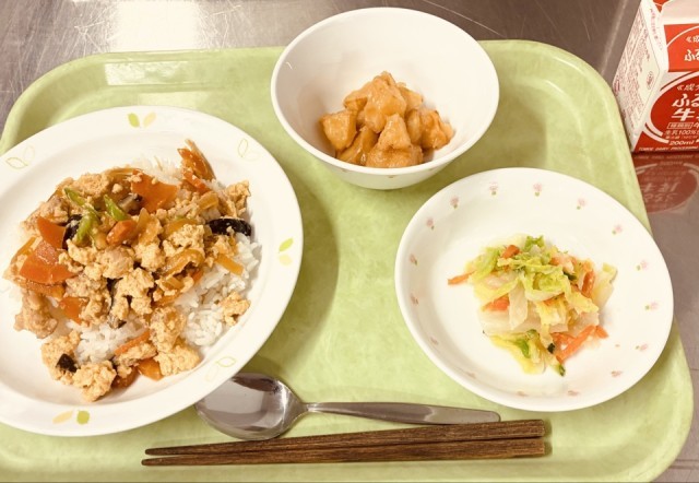 今日は、親子丼、白菜の柚子風味、味噌ポテト、牛乳です。