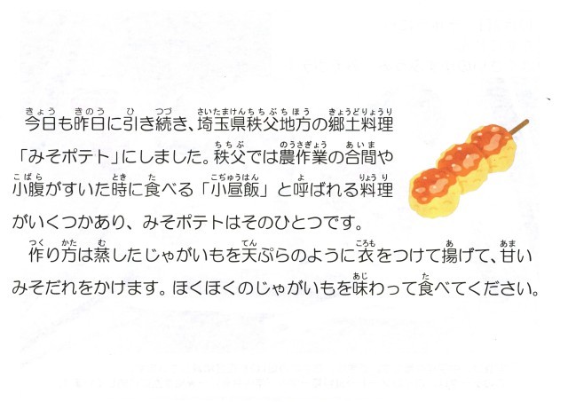 秩父には、多くの郷土りょうりがあり、昨日の「かて飯」、「ゼリーフライ」今日の「味噌ポテト」は、秩父の郷土料理の一部でしかありません。