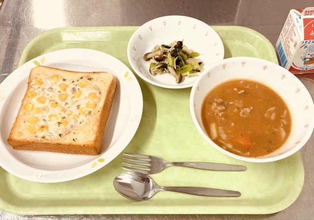 今日は、コーンマヨネーズパン、ポークシチュー、青菜ときのこのソテー、牛乳です。