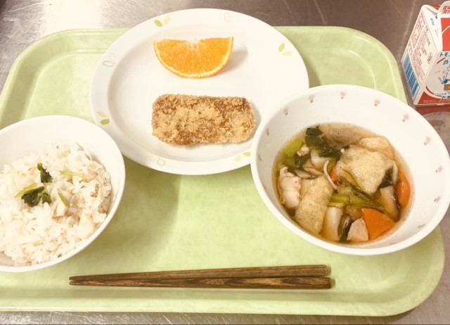 今日は、鯛めし、じゃこカツ、いもたき、果物(紅マドンナ)、牛乳です。