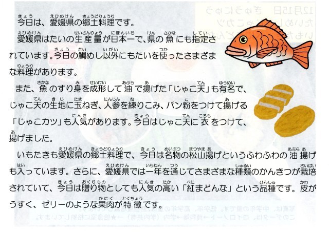 高級料理の「鯛めし」は、愛媛県の郷土料理なのですね。給食に出るとは驚きです。私の食べたいめしのナンバーワンかもしれません。