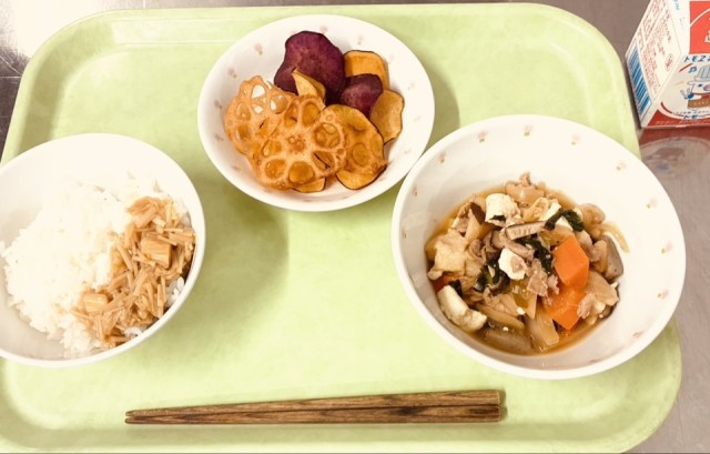 今日は、なめたけご飯、豆腐とお麩の煮物、根菜チップス、牛乳です。