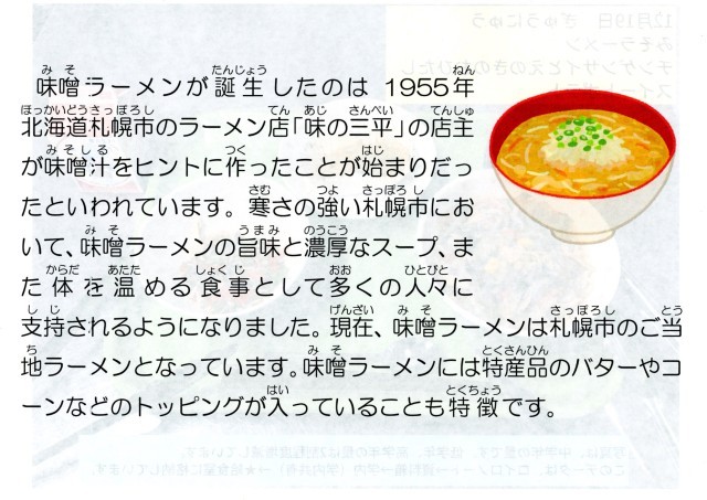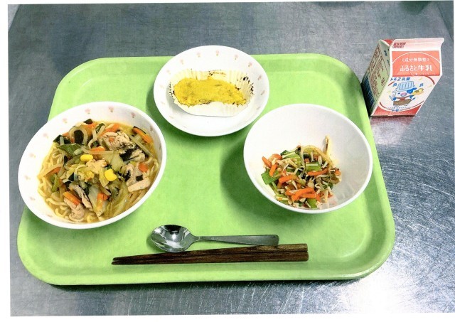 今日は、味噌ラーメン、チンゲン菜とえのきのお浸し、スイートポテト、牛乳です。