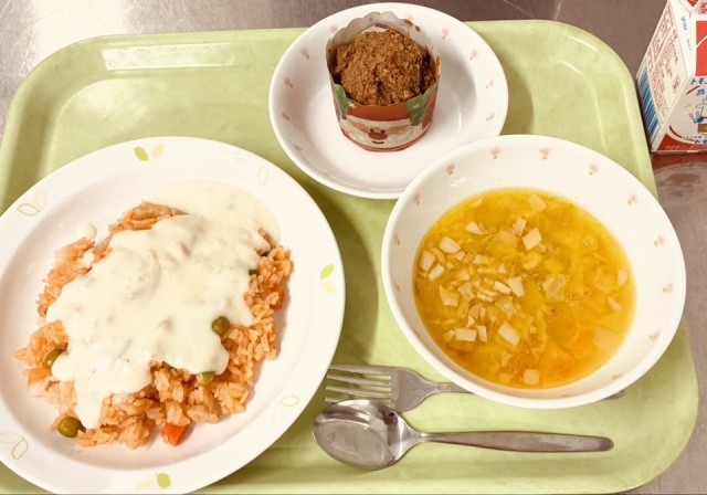 今日は、チキンライス・ホワイトソースかけ、はらぺこサンタのスープ、クリスマスケーキ、牛乳です。