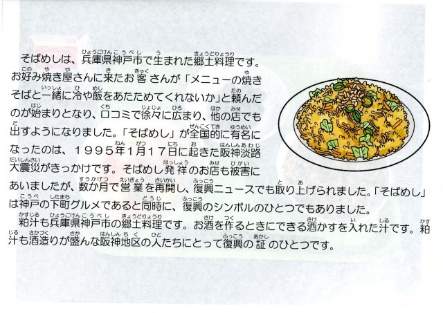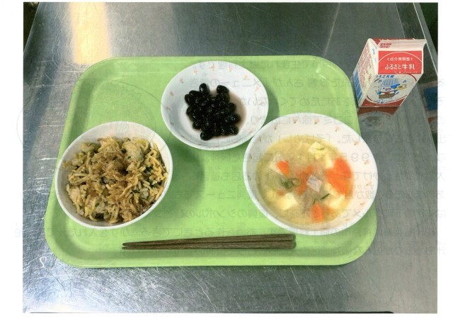 今日は、そばめし、黒豆、粕汁、牛乳です。