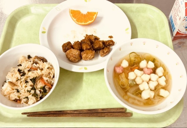 今日は、明日葉のきんぴらご飯、かつおの薬味ソースかけ、あぶらげ入りすまし汁、果物(クレメンティン)、牛乳です。