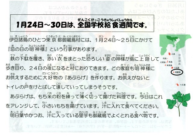 伊豆諸島には、ある種の日常的な行動を控える「物忌み」を地域全体で行う風習が残っています。その一つが「忌の日の明神様」です。三宅島と八丈島の間にある御蔵島は、三宅島や八丈島と見くらべると、小さな島です。島ごとに風習が違いますが、御蔵島では1月25日に「明神様」が島に上陸し、人に出会ったり、あぶらげを備えていなかったりすると蹴り飛ばすというから、恐ろしいですね。根くらな私は、御蔵島では生活できないかもしれません。