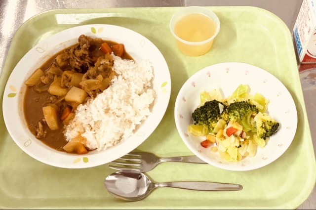 今日は、カレーライス、ブロッコリーサラダ、りんごゼリー、牛乳です。