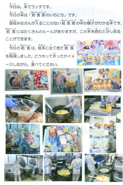 「給食室のいちにち」は、今日の給食と同じ献立を作るお話で、給食の作り方や給食室のいろいろなルールを紹介しています。